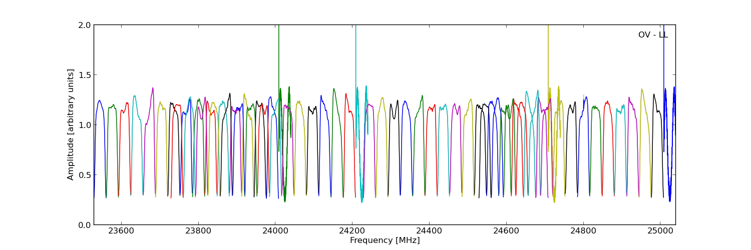 Total power spectrum in arbitrary units. The solid lines indicate the mean value and the shaded area the peaks.