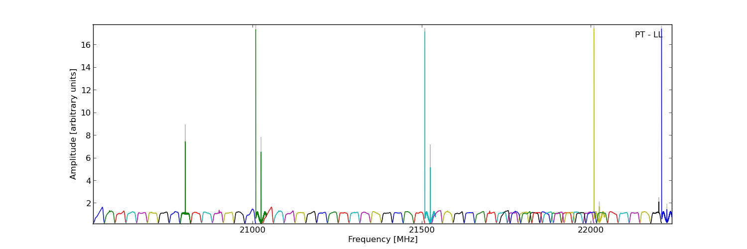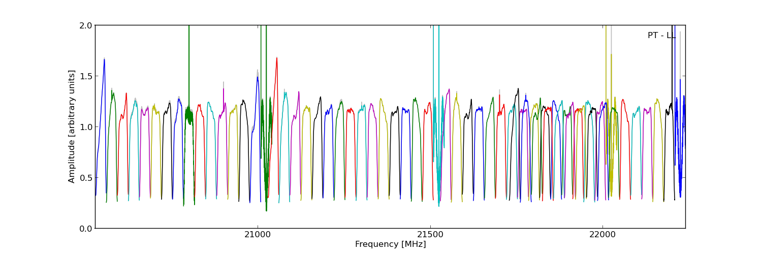 Total power spectrum in arbitrary units. The solid lines indicate the mean value and the shaded area the peaks.