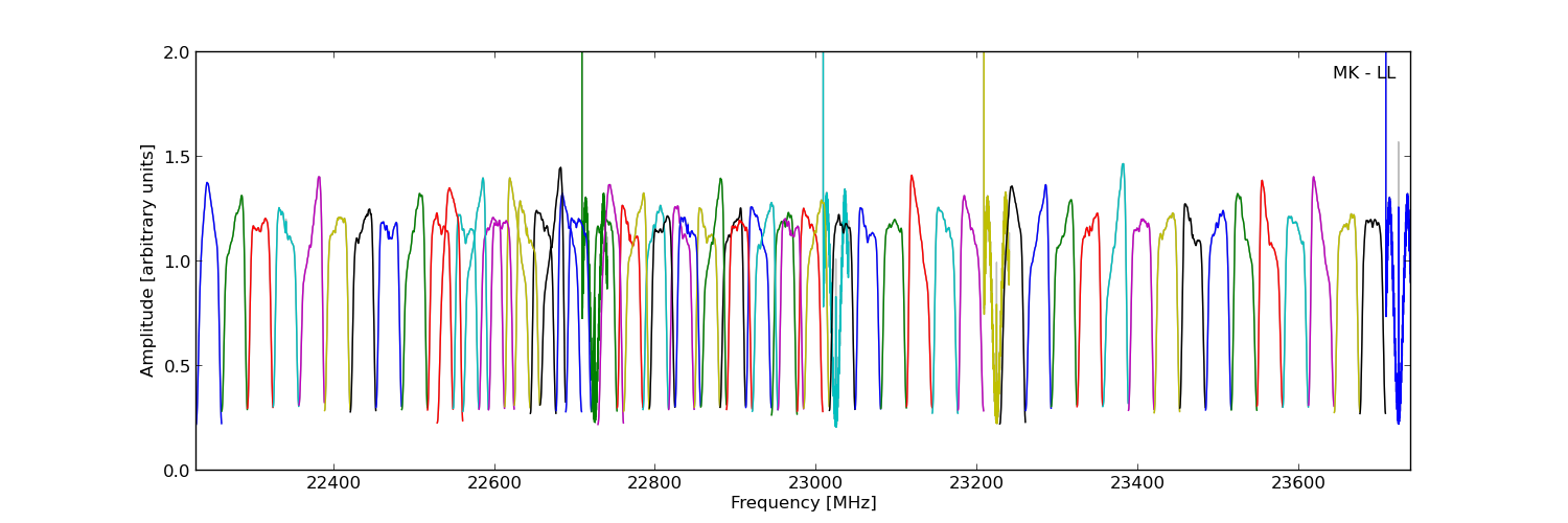 Total power spectrum in arbitrary units. The solid lines indicate the mean value and the shaded area the peaks.