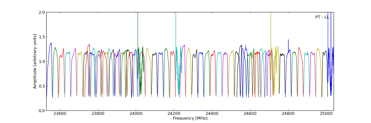 Total power spectrum in arbitrary units. The solid lines indicate the mean value and the shaded area the peaks.