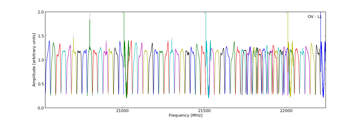 Total power spectrum in arbitrary units. The solid lines indicate the mean value and the shaded area the peaks.