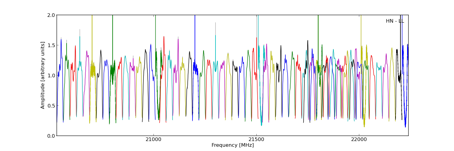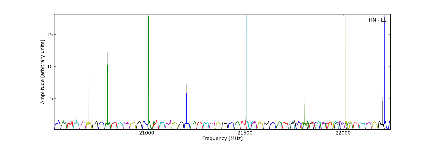 Total power spectrum in arbitrary units. The solid lines indicate the mean value and the shaded area the peaks.