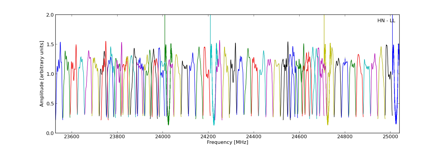 Total power spectrum in arbitrary units. The solid lines indicate the mean value and the shaded area the peaks.