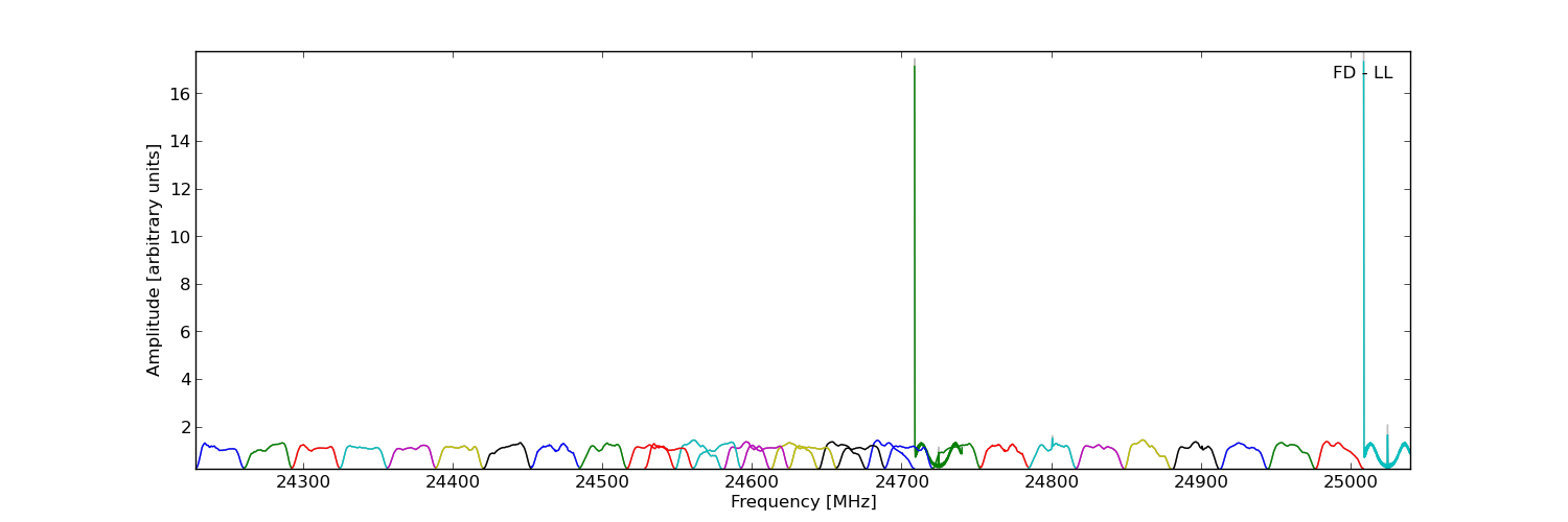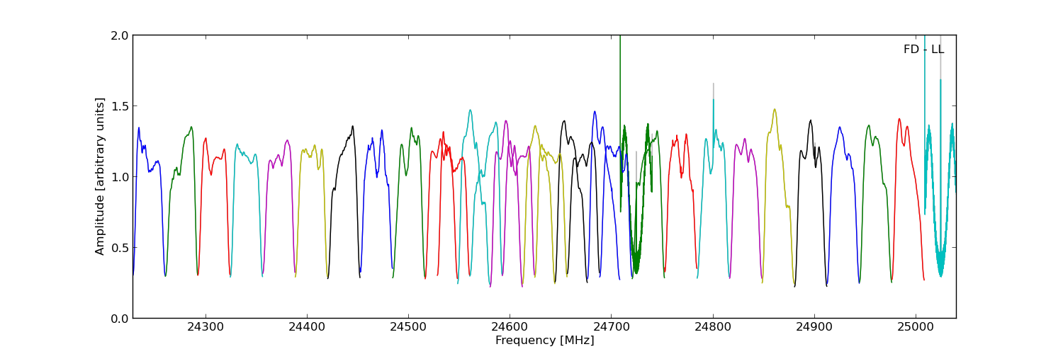Total power spectrum in arbitrary units. The solid lines indicate the mean value and the shaded area the peaks.