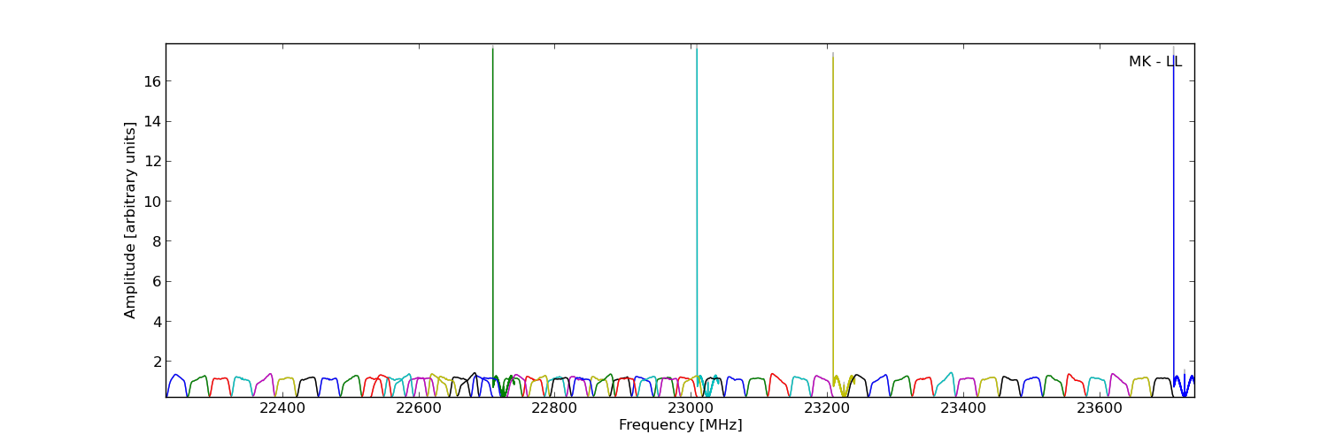 Total power spectrum in arbitrary units. The solid lines indicate the mean value and the shaded area the peaks.