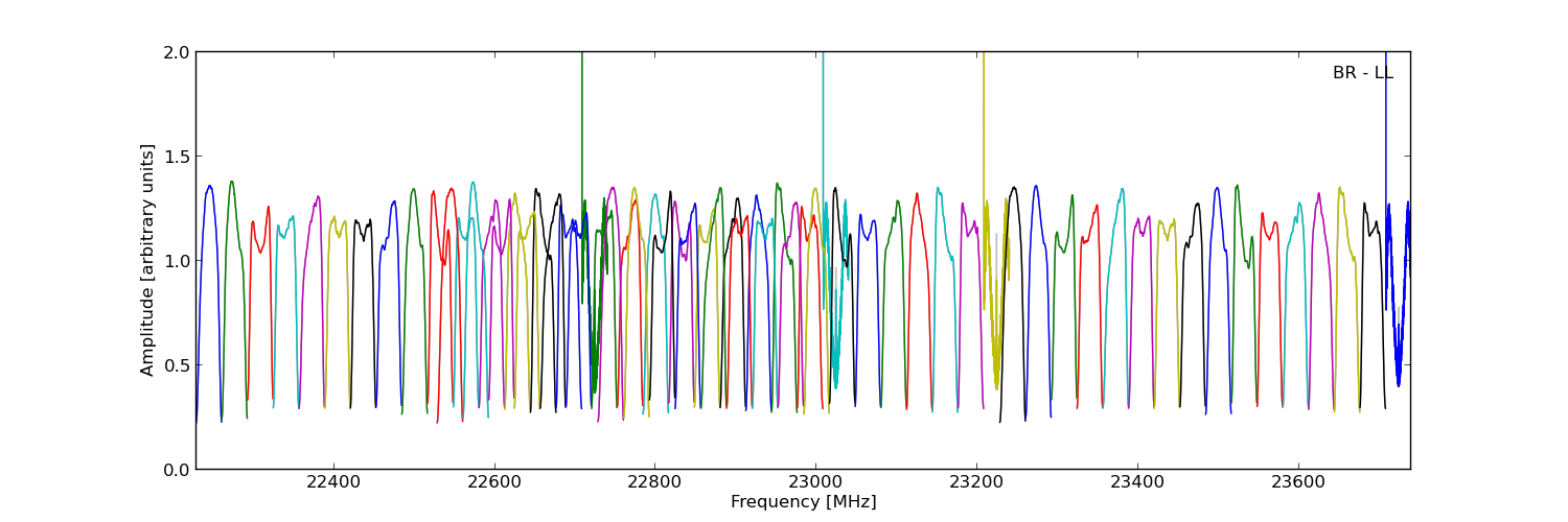 Total power spectrum in arbitrary units. The solid lines indicate the mean value and the shaded area the peaks.