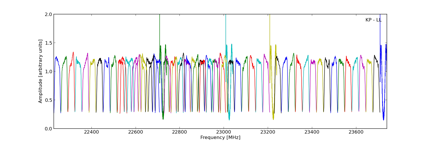 Total power spectrum in arbitrary units. The solid lines indicate the mean value and the shaded area the peaks.