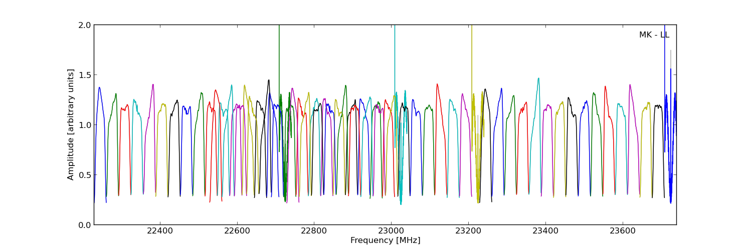 Total power spectrum in arbitrary units. The solid lines indicate the mean value and the shaded area the peaks.