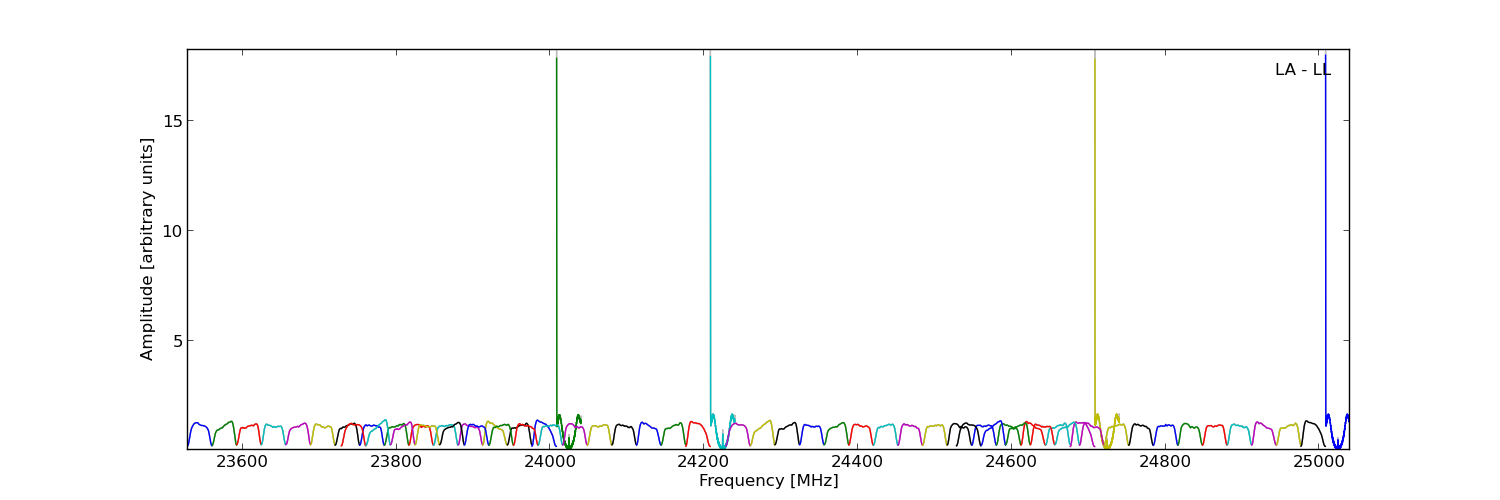 Total power spectrum in arbitrary units. The solid lines indicate the mean value and the shaded area the peaks.