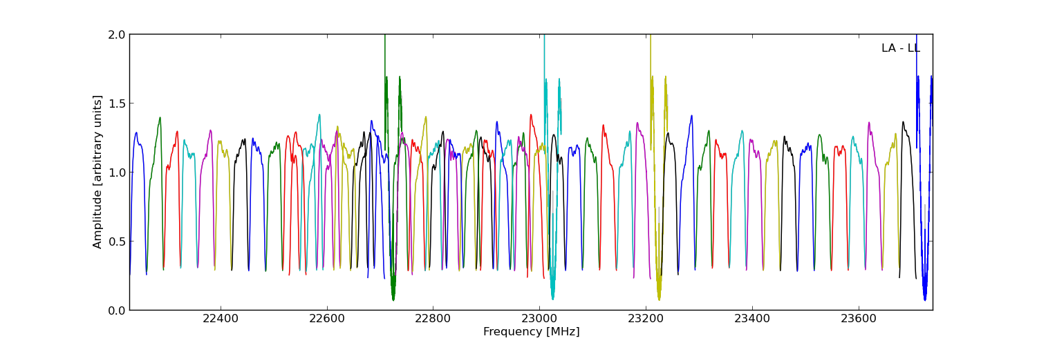 Total power spectrum in arbitrary units. The solid lines indicate the mean value and the shaded area the peaks.
