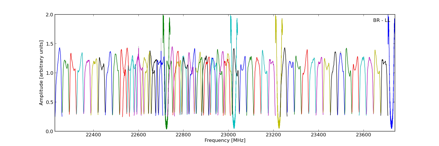 Total power spectrum in arbitrary units. The solid lines indicate the mean value and the shaded area the peaks.