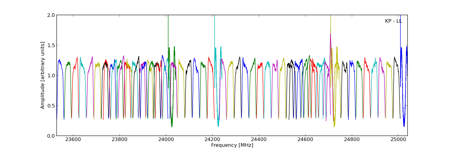 Total power spectrum in arbitrary units. The solid lines indicate the mean value and the shaded area the peaks.