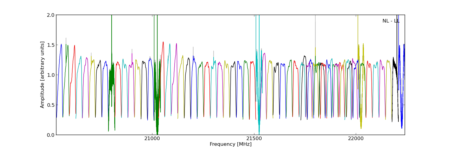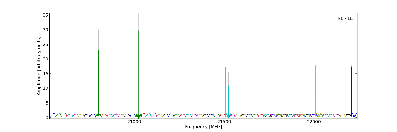 Total power spectrum in arbitrary units. The solid lines indicate the mean value and the shaded area the peaks.