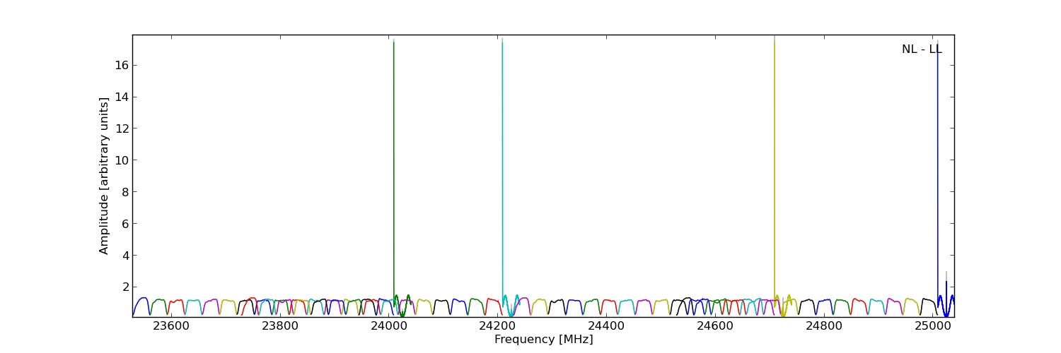Total power spectrum in arbitrary units. The solid lines indicate the mean value and the shaded area the peaks.