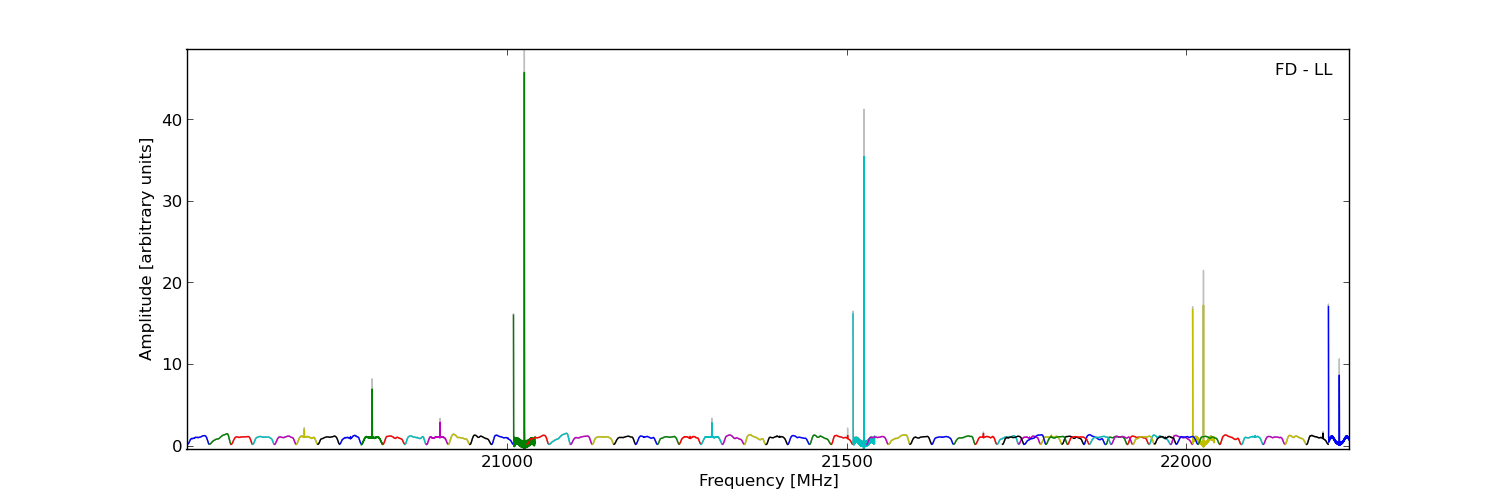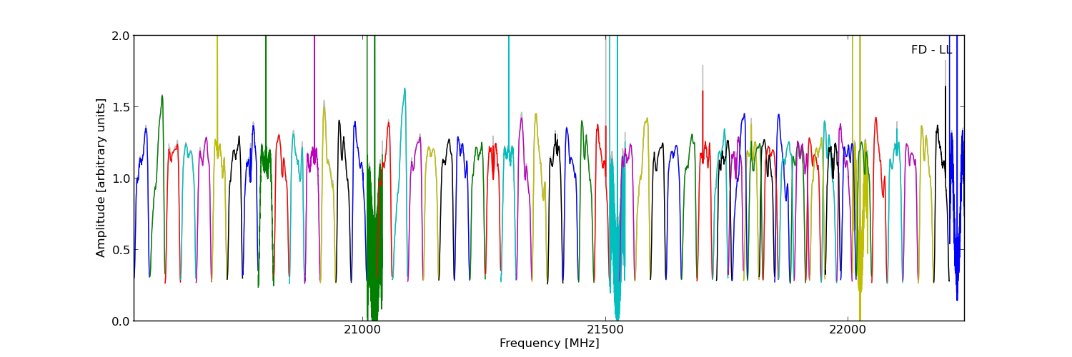 Total power spectrum in arbitrary units. The solid lines indicate the mean value and the shaded area the peaks.