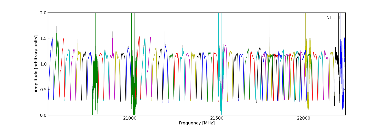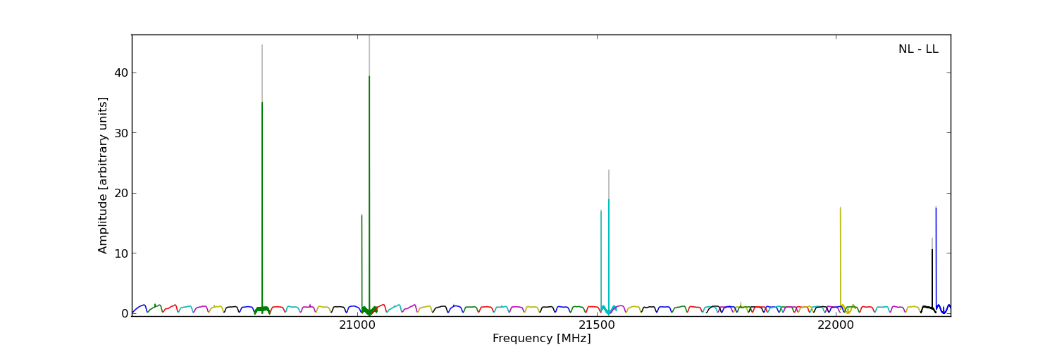 Total power spectrum in arbitrary units. The solid lines indicate the mean value and the shaded area the peaks.