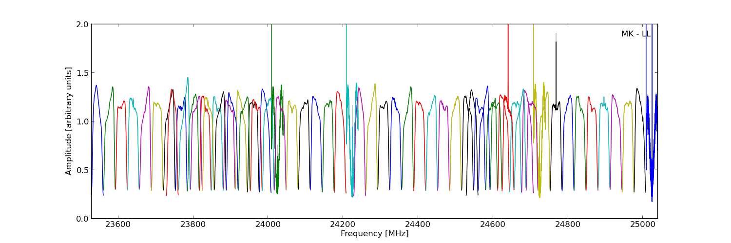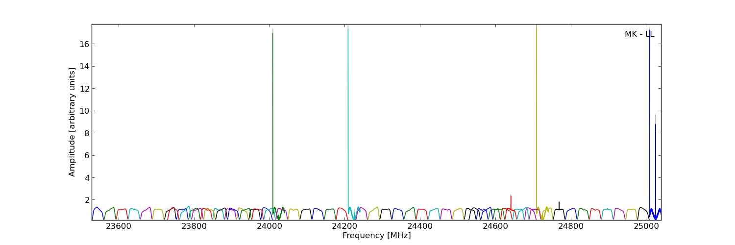 Total power spectrum in arbitrary units. The solid lines indicate the mean value and the shaded area the peaks.