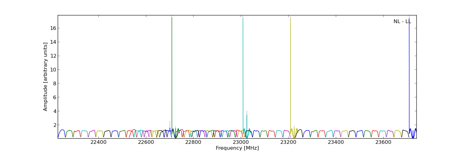 Total power spectrum in arbitrary units. The solid lines indicate the mean value and the shaded area the peaks.