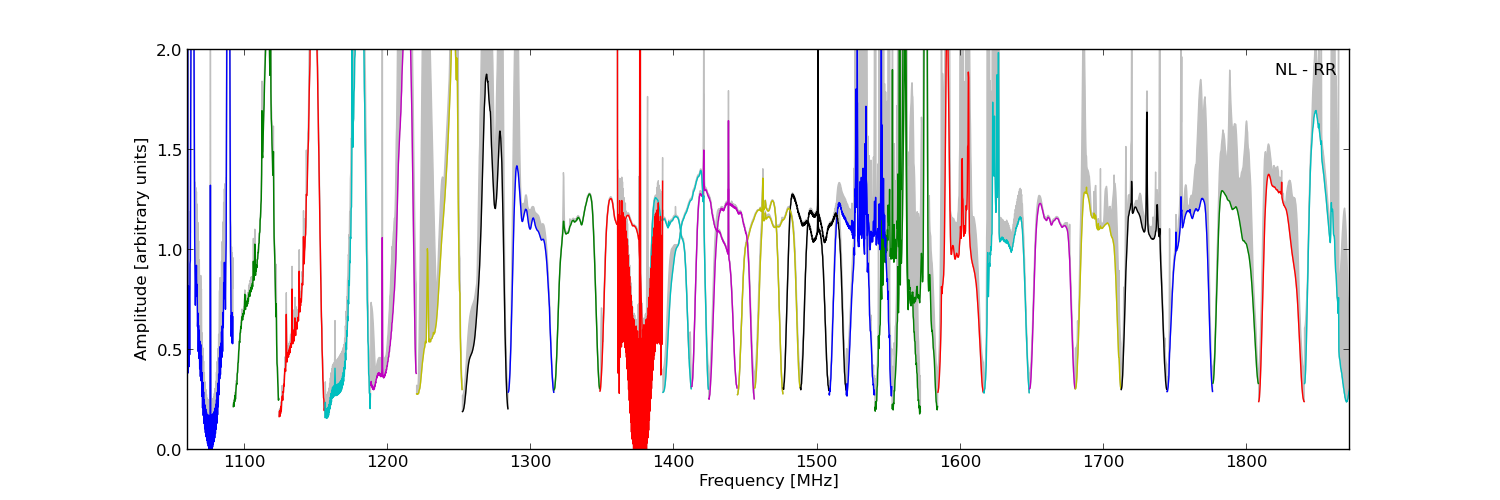 Total power spectrum in arbitrary units. The solid lines indicate the mean value and the shaded area the peaks.