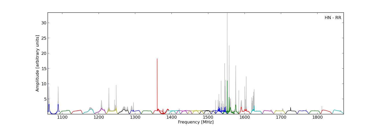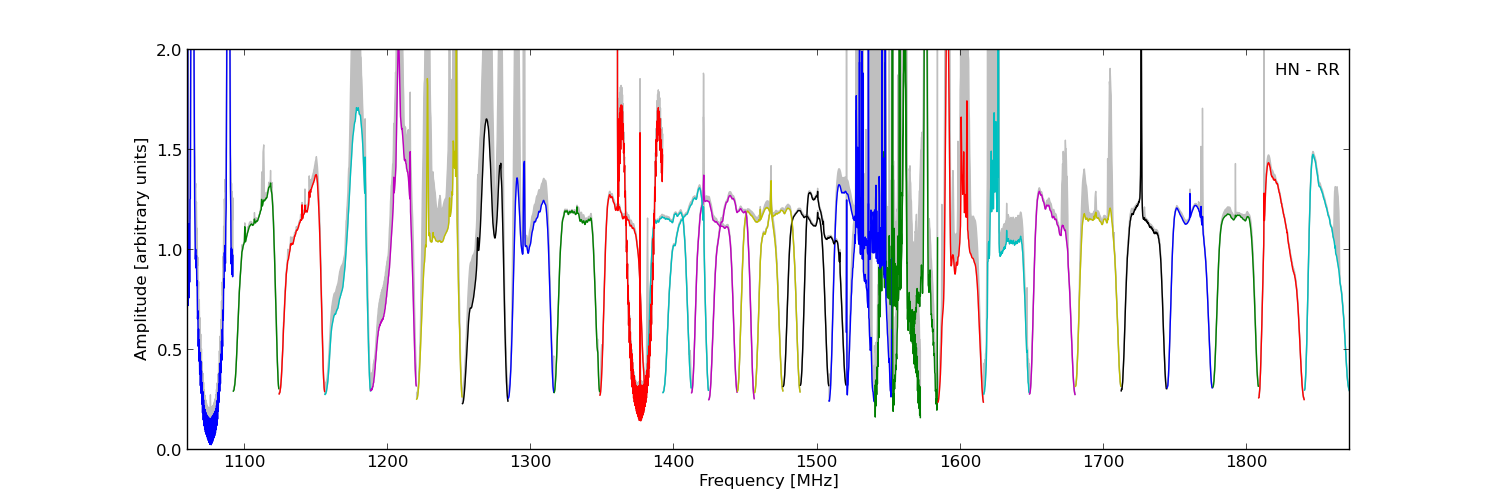 Total power spectrum in arbitrary units. The solid lines indicate the mean value and the shaded area the peaks.