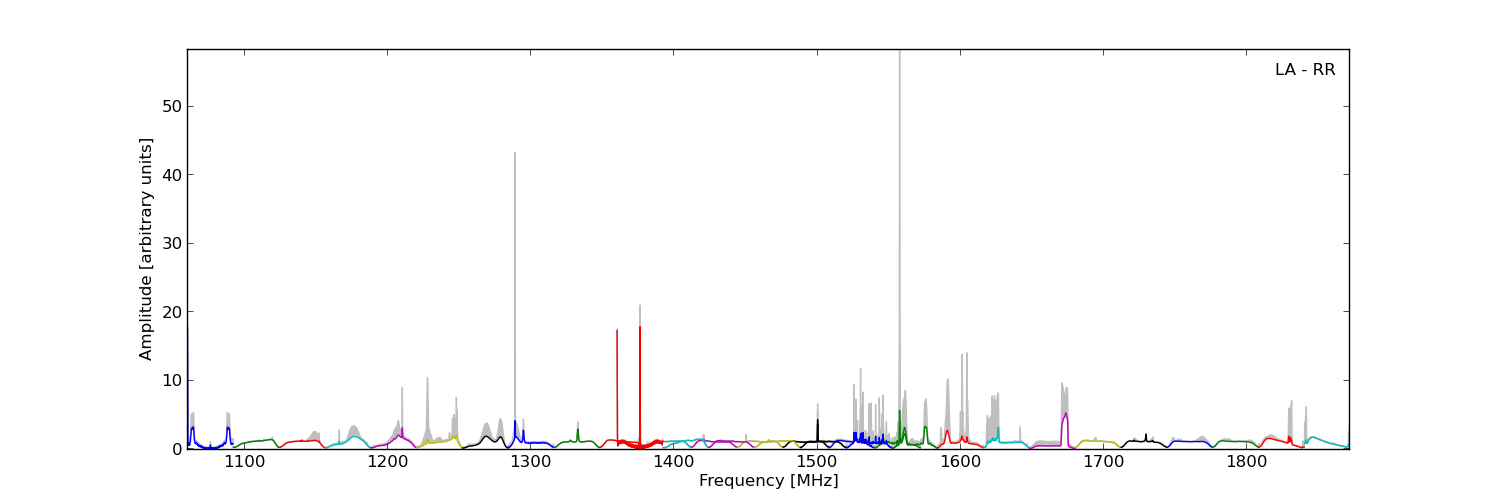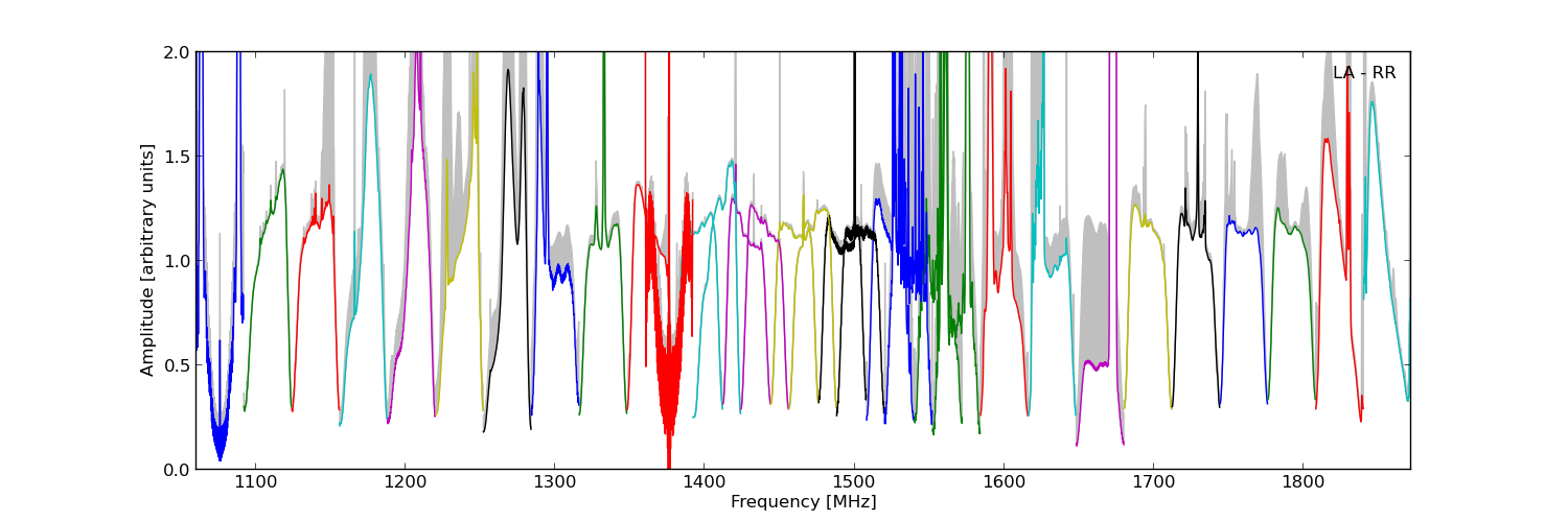 Total power spectrum in arbitrary units. The solid lines indicate the mean value and the shaded area the peaks.