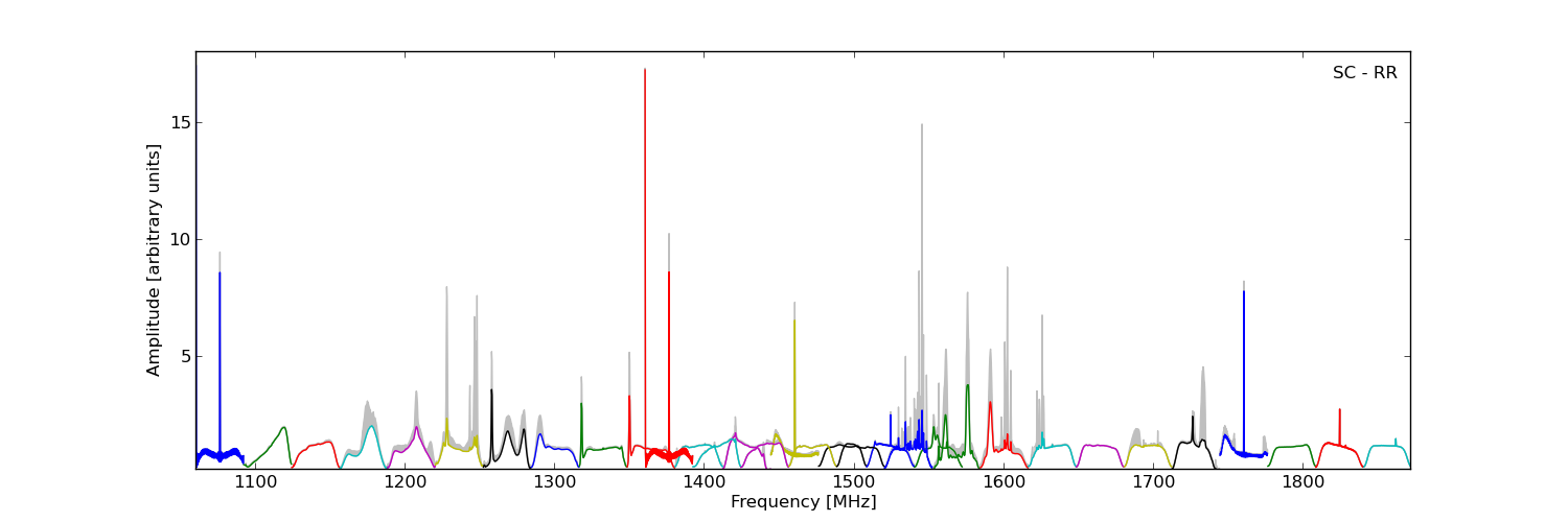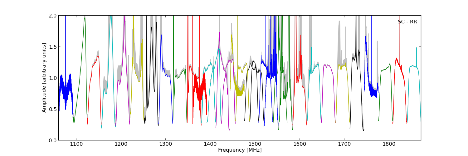 Total power spectrum in arbitrary units. The solid lines indicate the mean value and the shaded area the peaks.