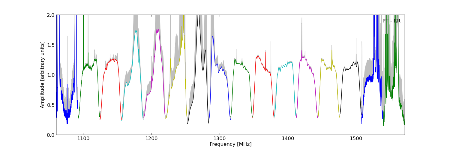 Total power spectrum in arbitrary units. The solid lines indicate the mean value and the shaded area the peaks.