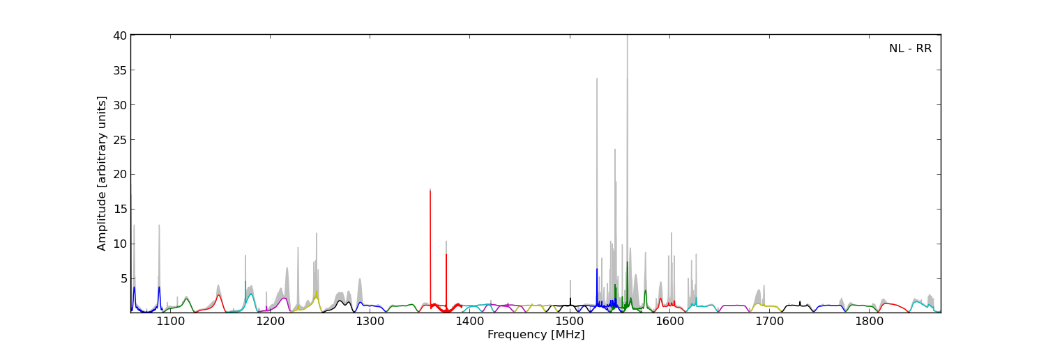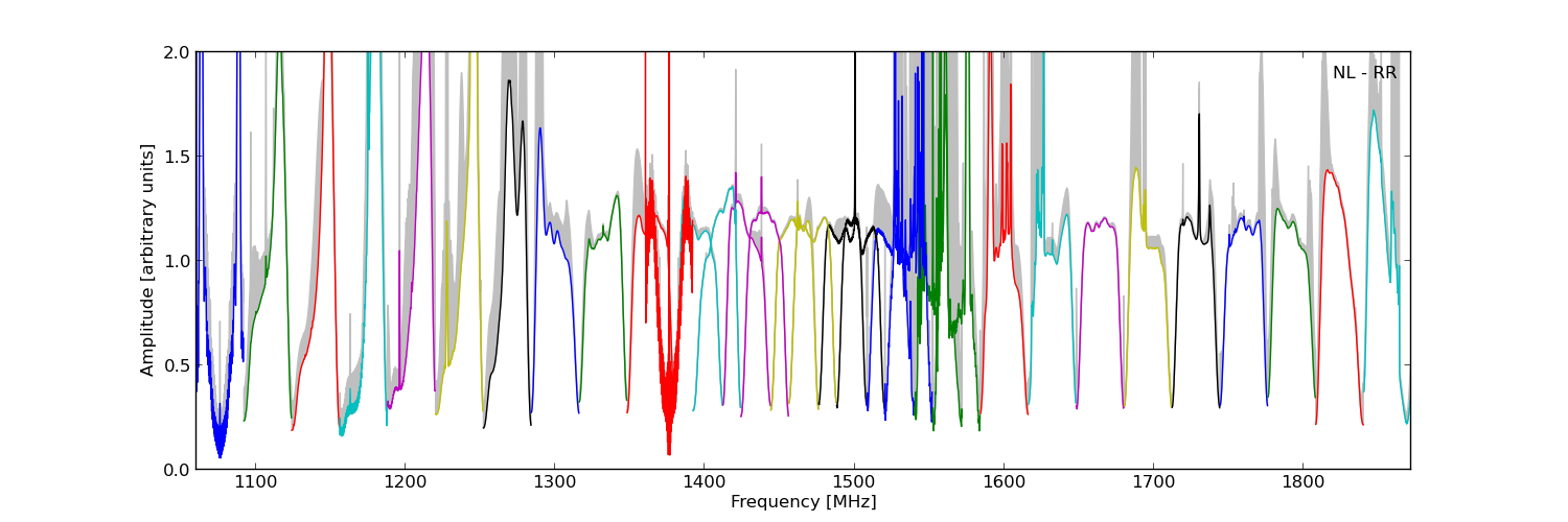 Total power spectrum in arbitrary units. The solid lines indicate the mean value and the shaded area the peaks.