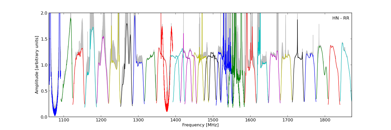 Total power spectrum in arbitrary units. The solid lines indicate the mean value and the shaded area the peaks.