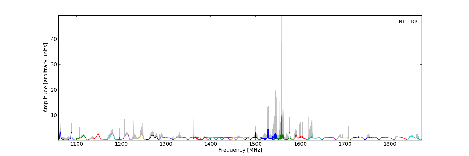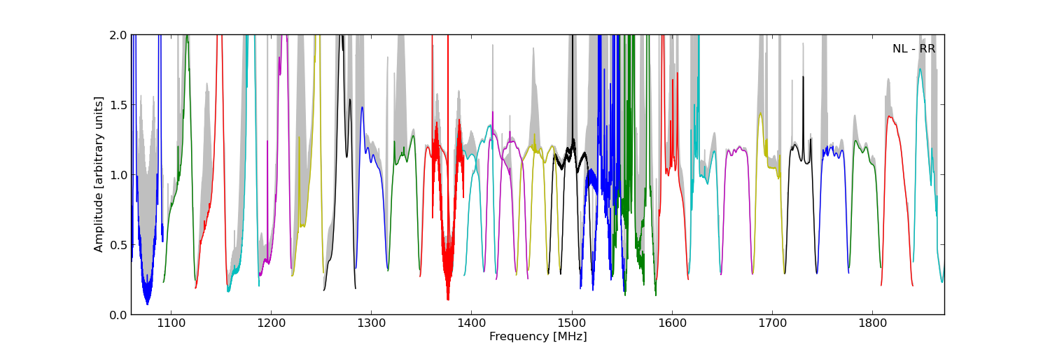 Total power spectrum in arbitrary units. The solid lines indicate the mean value and the shaded area the peaks.