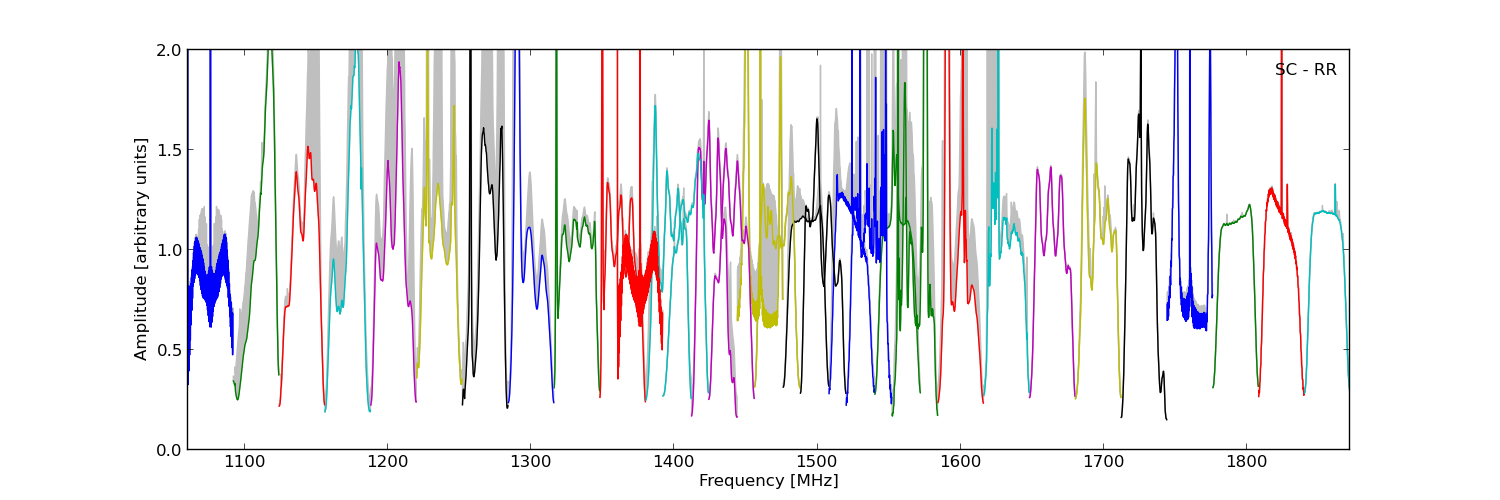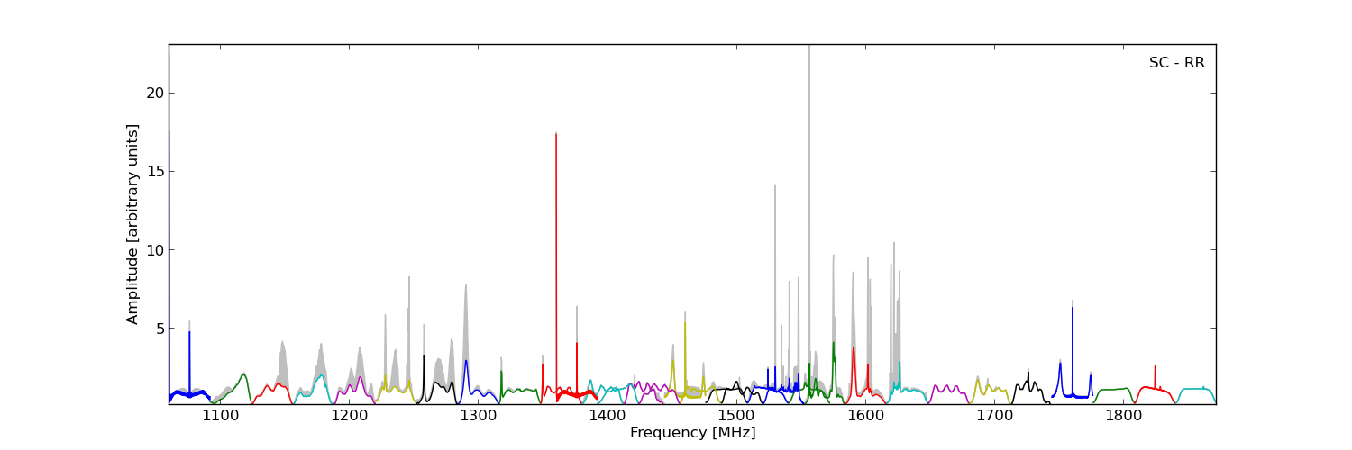 Total power spectrum in arbitrary units. The solid lines indicate the mean value and the shaded area the peaks.