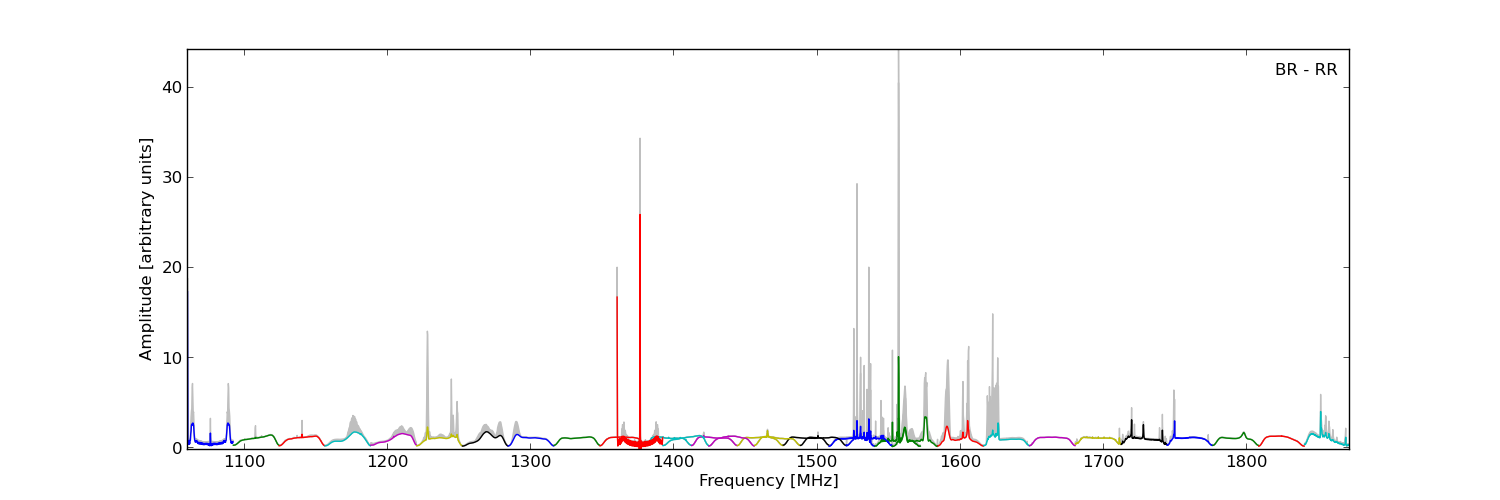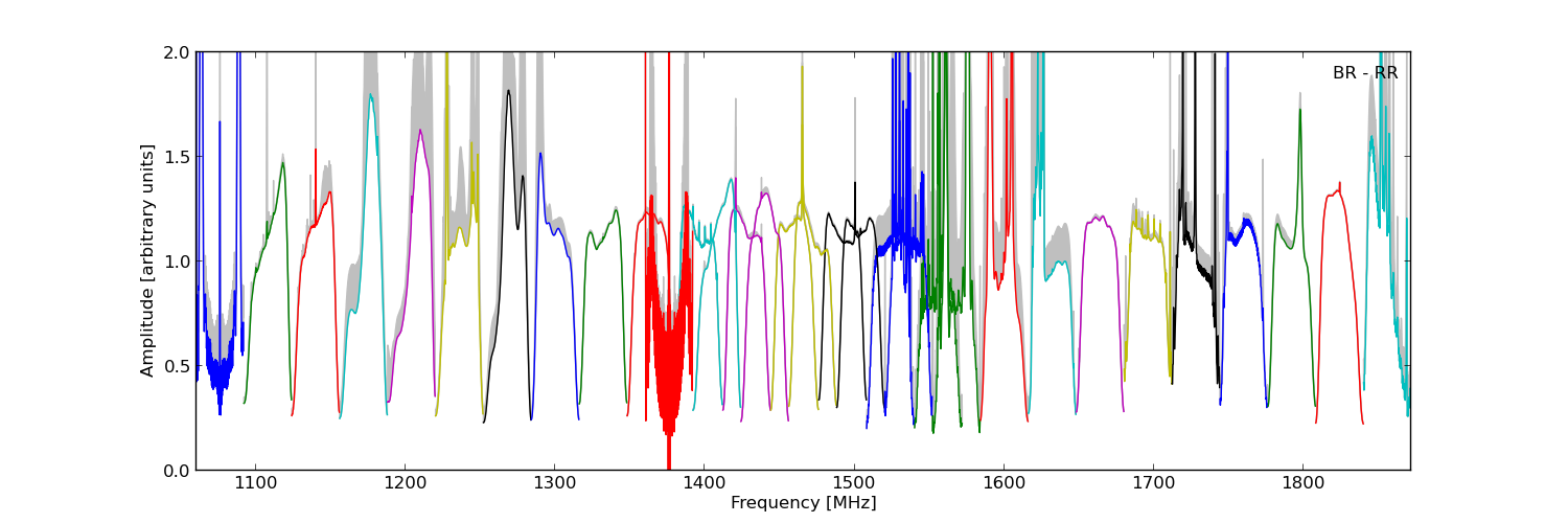 Total power spectrum in arbitrary units. The solid lines indicate the mean value and the shaded area the peaks.