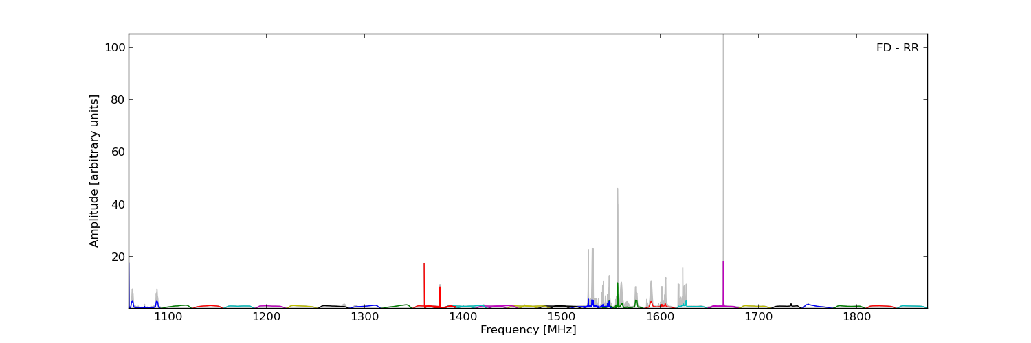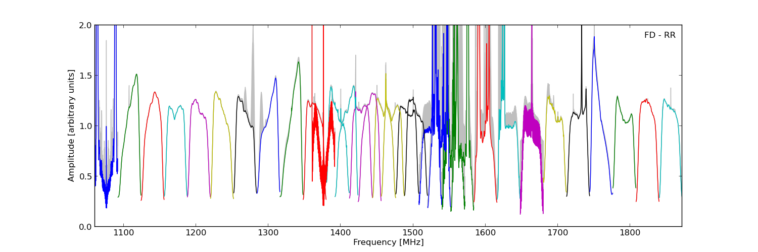 Total power spectrum in arbitrary units. The solid lines indicate the mean value and the shaded area the peaks.