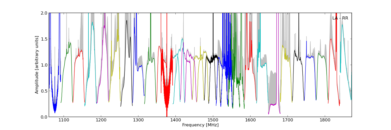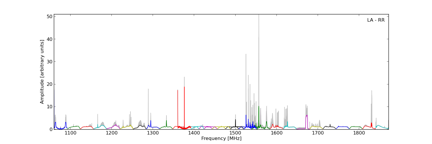 Total power spectrum in arbitrary units. The solid lines indicate the mean value and the shaded area the peaks.