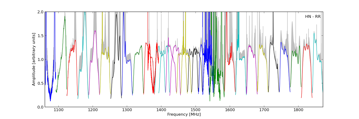 Total power spectrum in arbitrary units. The solid lines indicate the mean value and the shaded area the peaks.