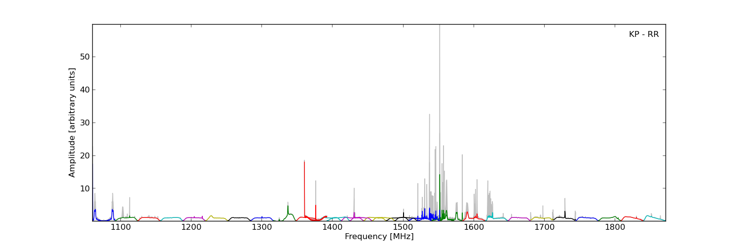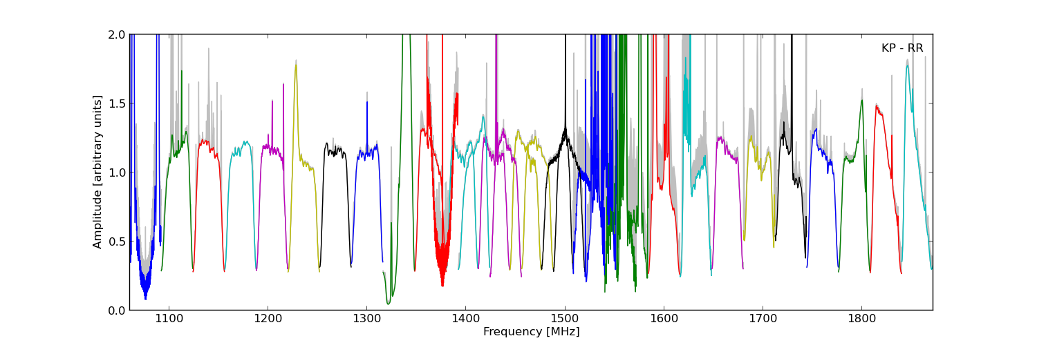 Total power spectrum in arbitrary units. The solid lines indicate the mean value and the shaded area the peaks.