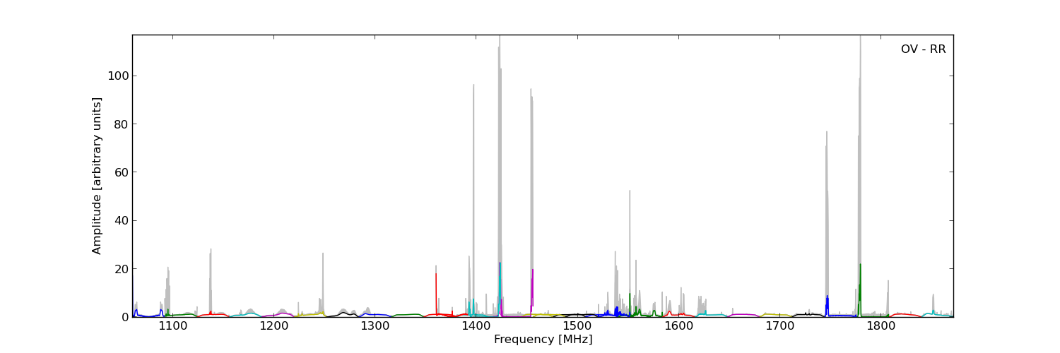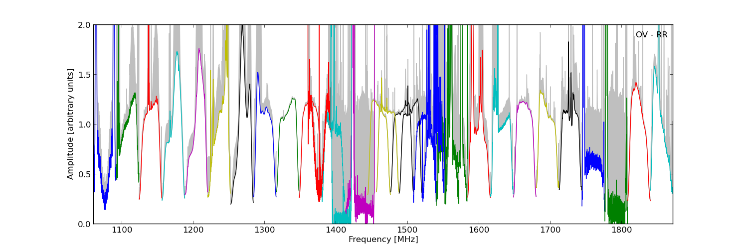Total power spectrum in arbitrary units. The solid lines indicate the mean value and the shaded area the peaks.