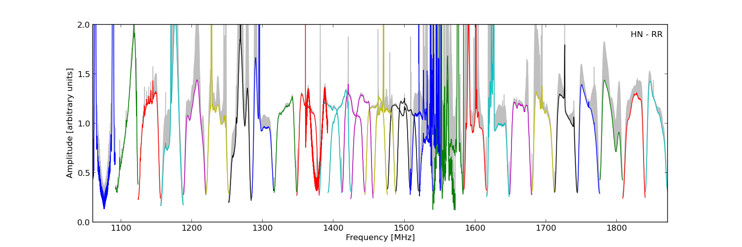 Total power spectrum in arbitrary units. The solid lines indicate the mean value and the shaded area the peaks.
