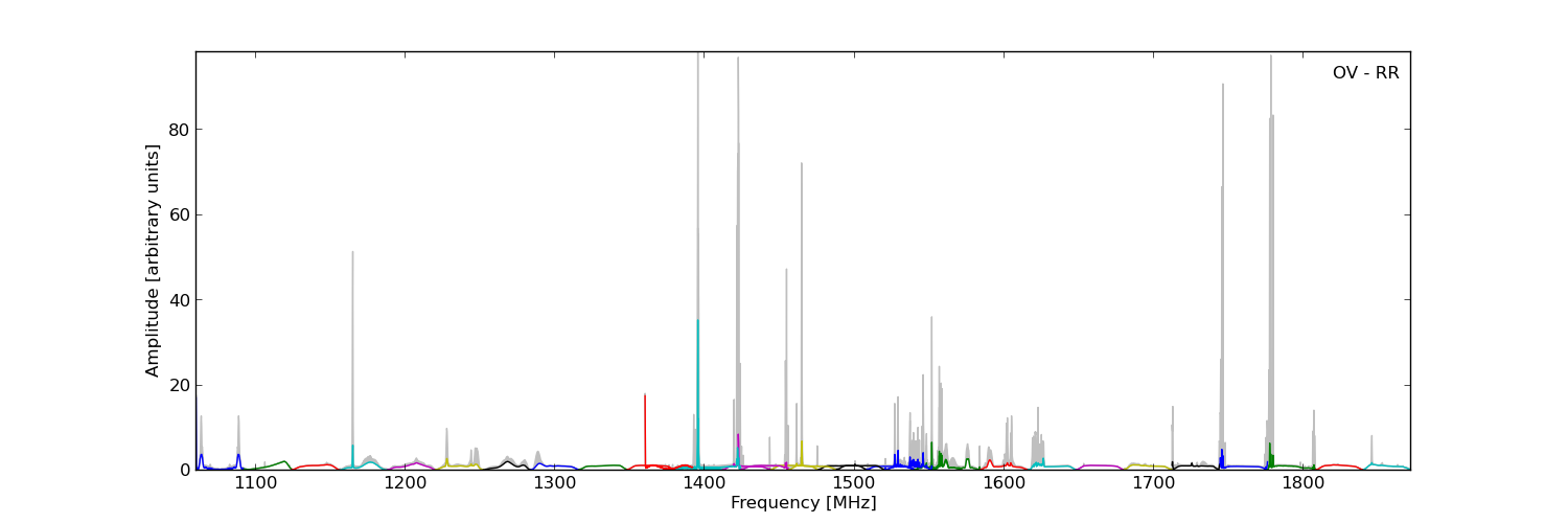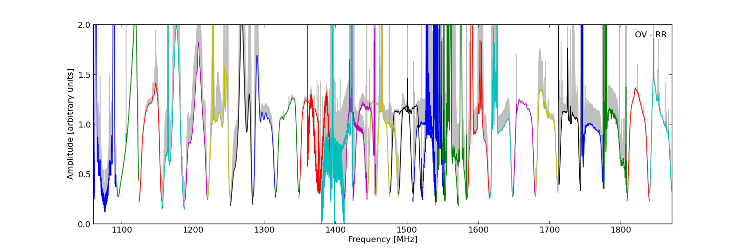 Total power spectrum in arbitrary units. The solid lines indicate the mean value and the shaded area the peaks.
