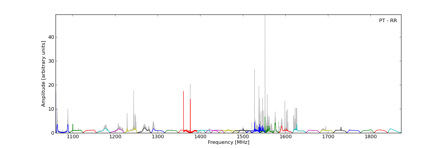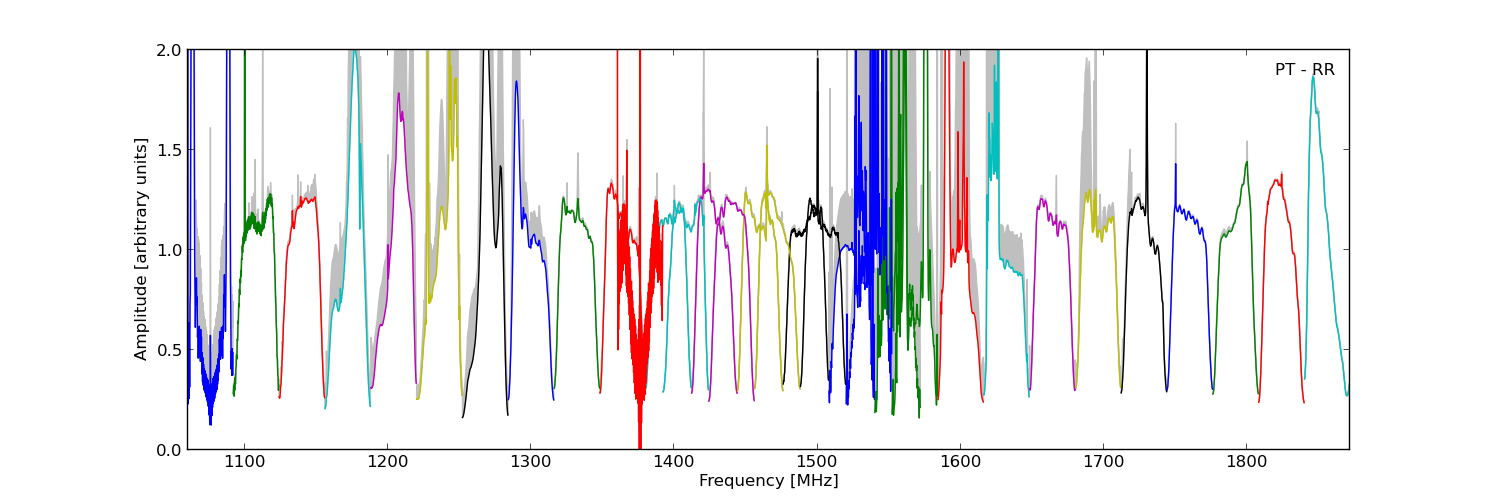 Total power spectrum in arbitrary units. The solid lines indicate the mean value and the shaded area the peaks.