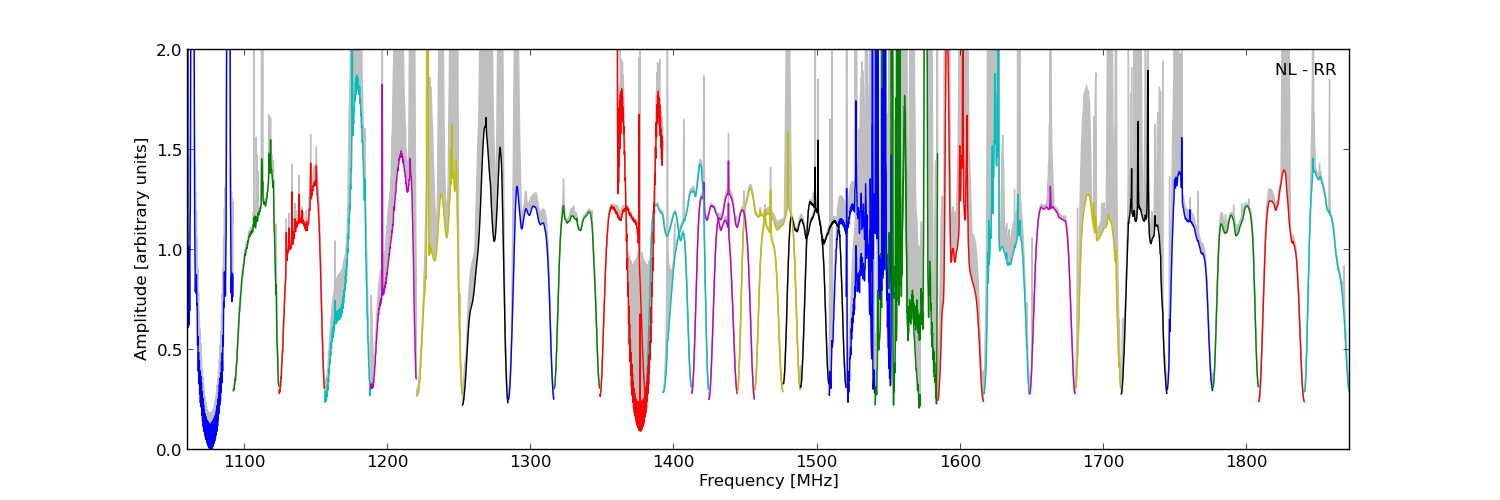 Total power spectrum in arbitrary units. The solid lines indicate the mean value and the shaded area the peaks.