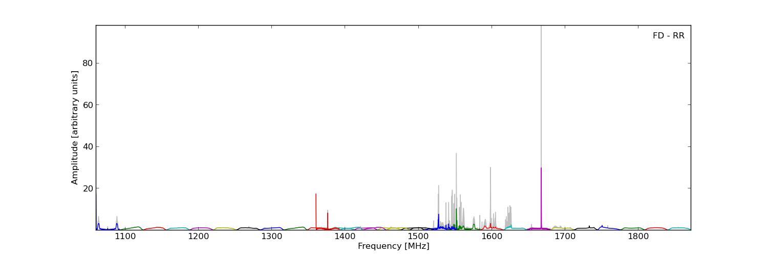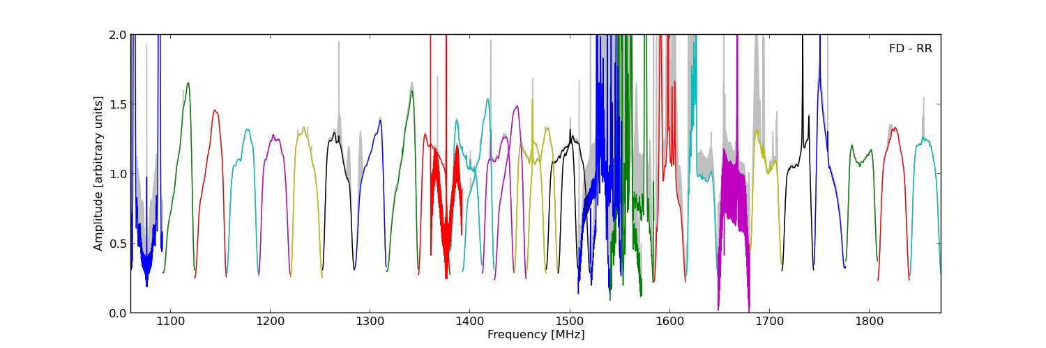 Total power spectrum in arbitrary units. The solid lines indicate the mean value and the shaded area the peaks.