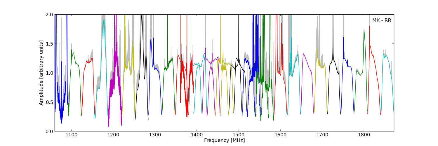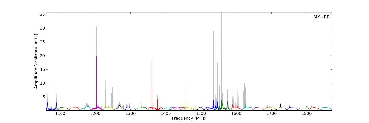 Total power spectrum in arbitrary units. The solid lines indicate the mean value and the shaded area the peaks.