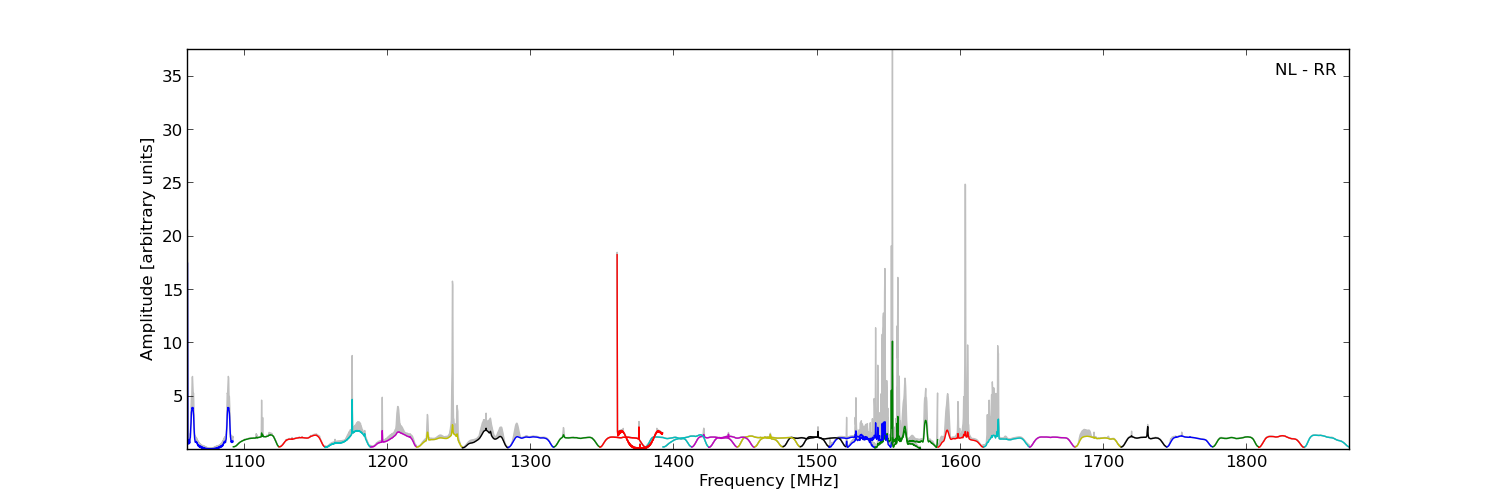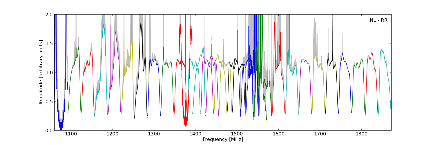 Total power spectrum in arbitrary units. The solid lines indicate the mean value and the shaded area the peaks.