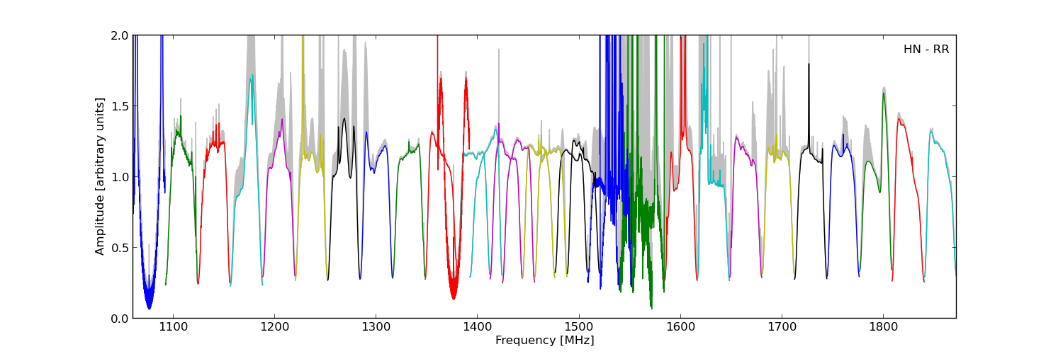 Total power spectrum in arbitrary units. The solid lines indicate the mean value and the shaded area the peaks.