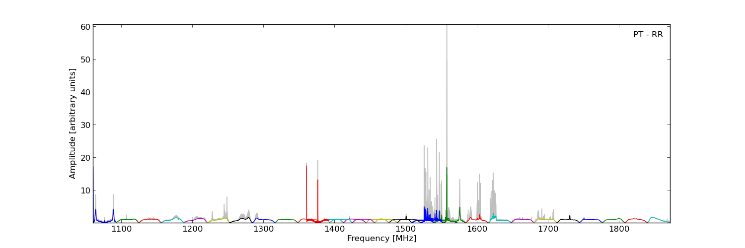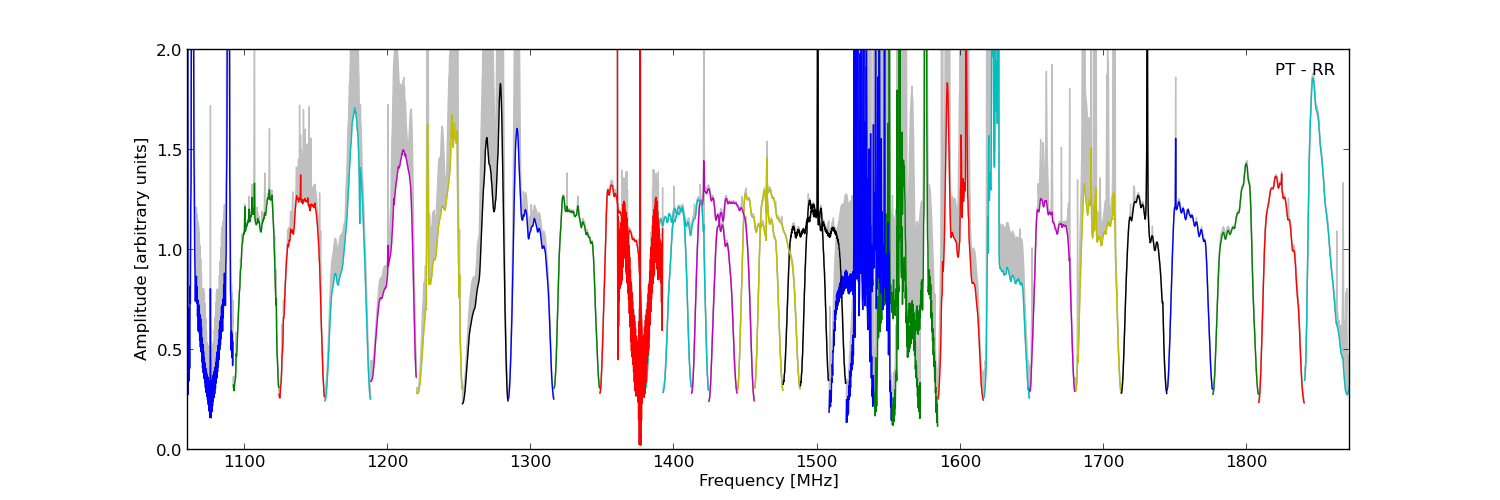 Total power spectrum in arbitrary units. The solid lines indicate the mean value and the shaded area the peaks.