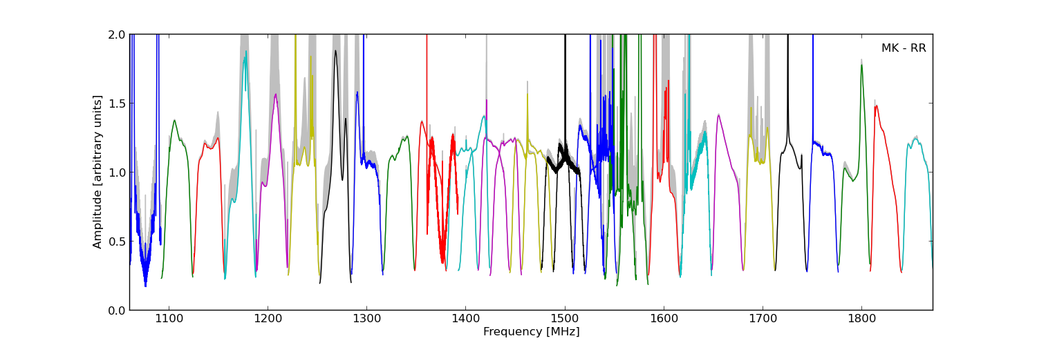 Total power spectrum in arbitrary units. The solid lines indicate the mean value and the shaded area the peaks.