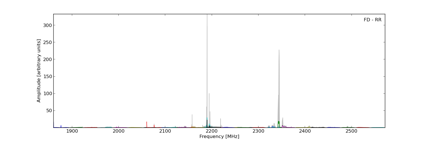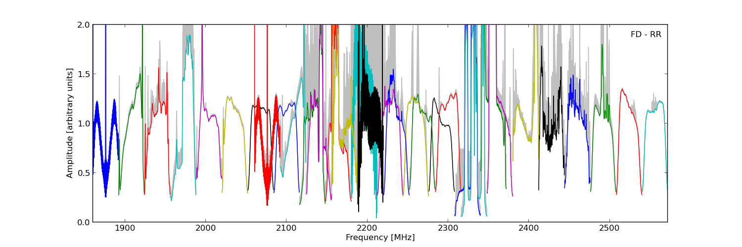Total power spectrum in arbitrary units. The solid lines indicate the mean value and the shaded area the peaks.