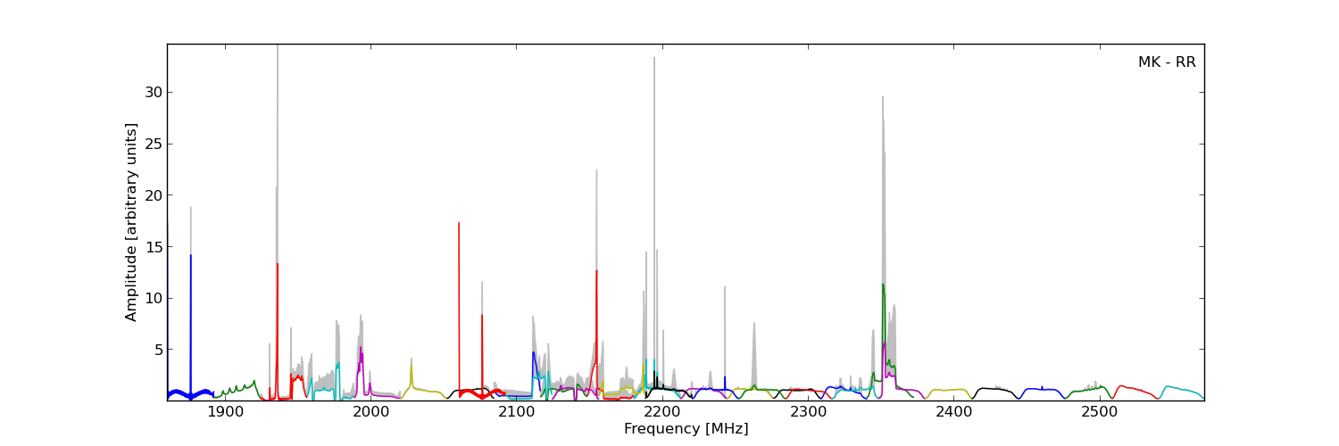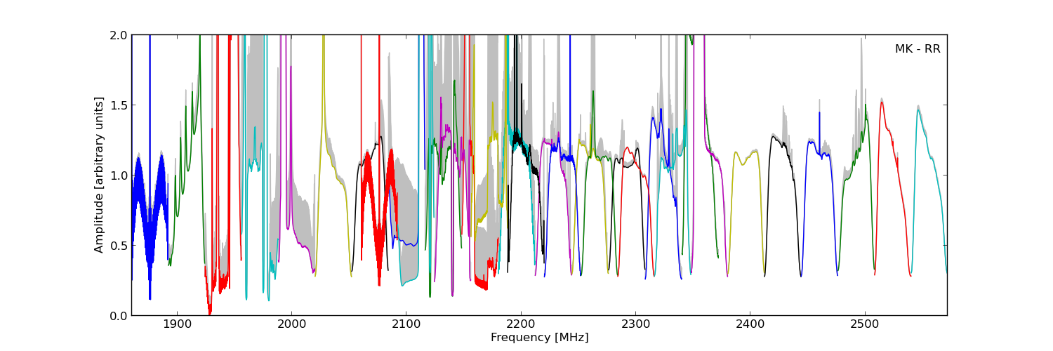 Total power spectrum in arbitrary units. The solid lines indicate the mean value and the shaded area the peaks.