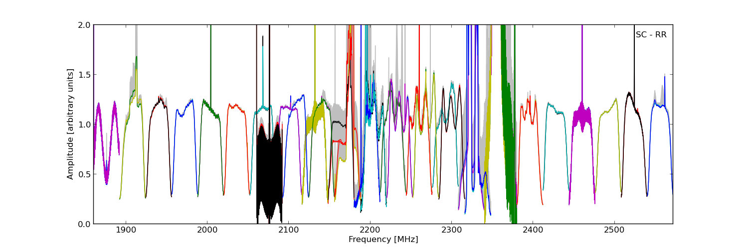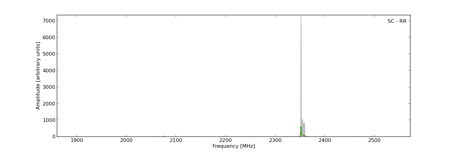Total power spectrum in arbitrary units. The solid lines indicate the mean value and the shaded area the peaks.